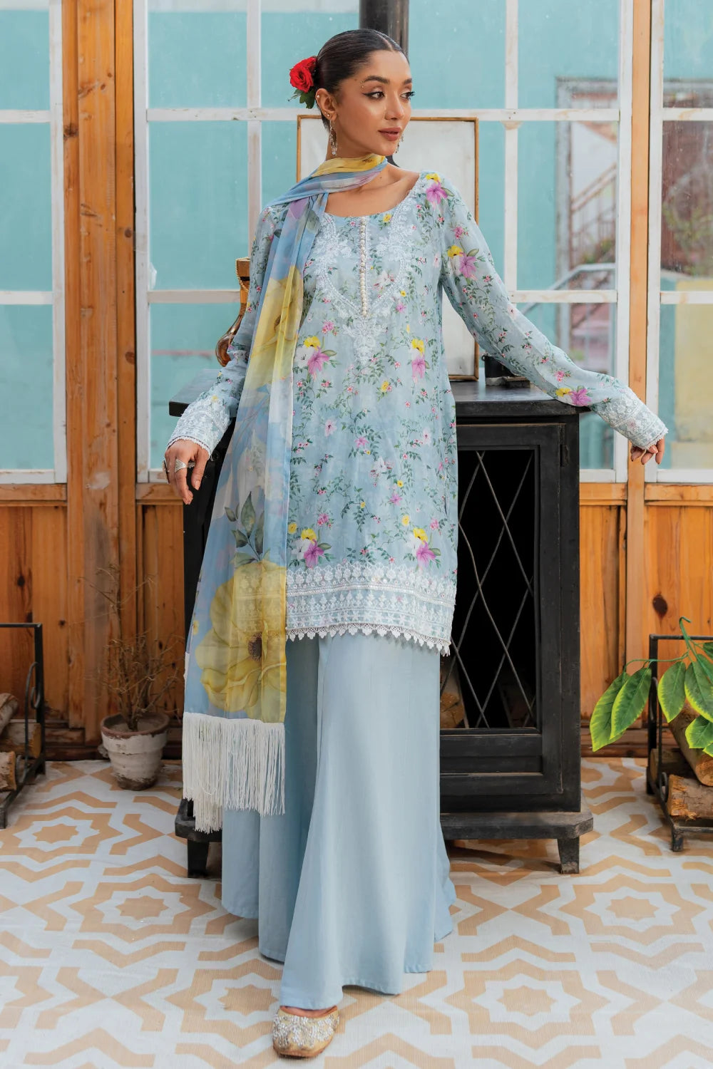 Step into colorful serenity with our Ice Blue 3-Piece Printed Lawn Suit.