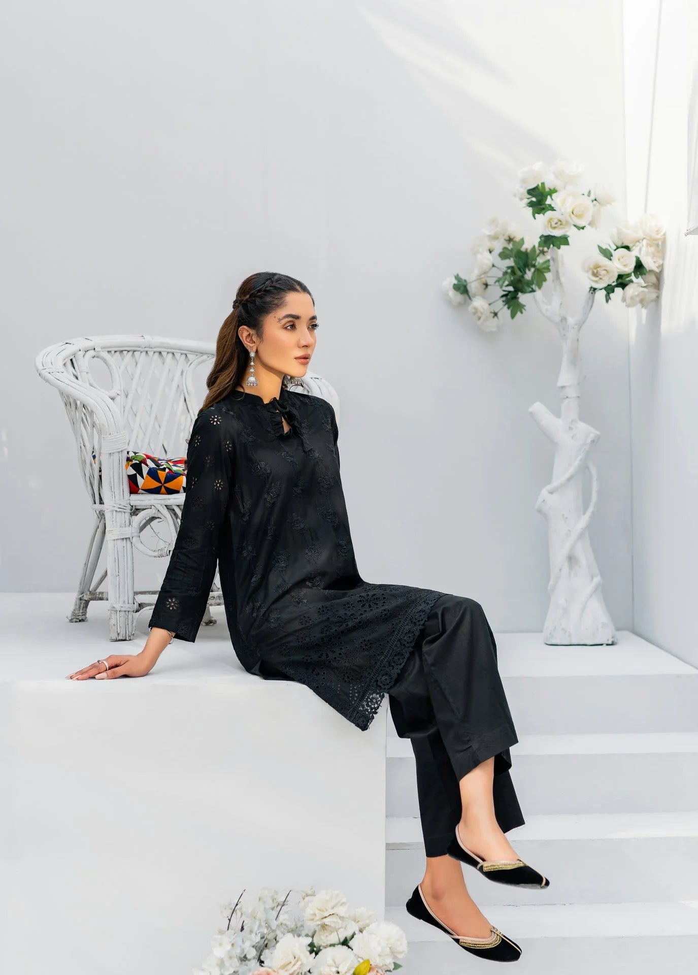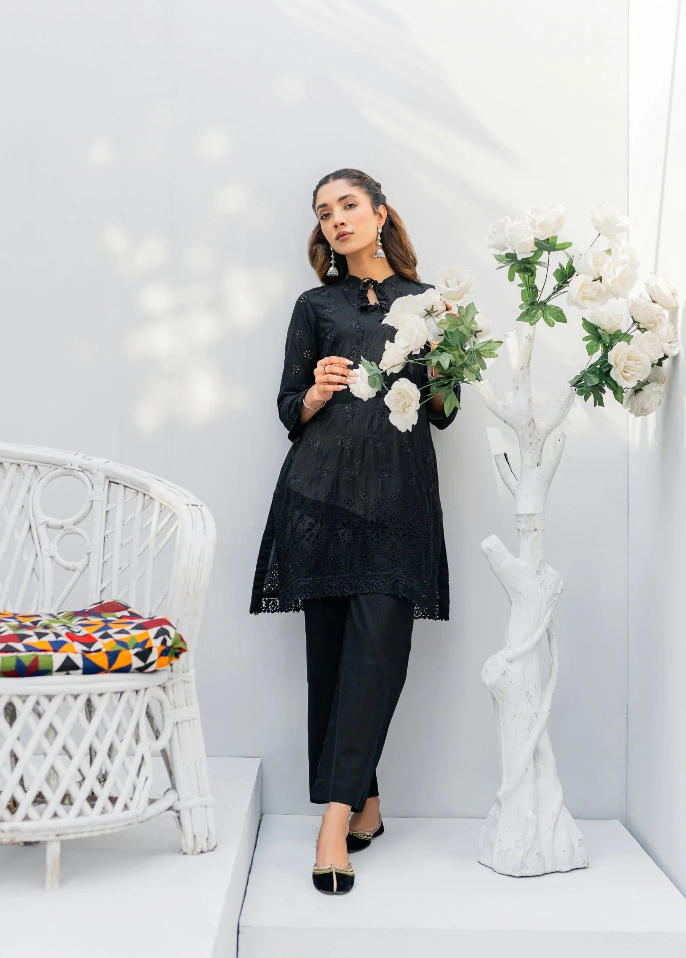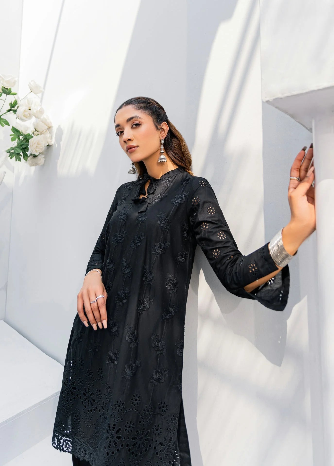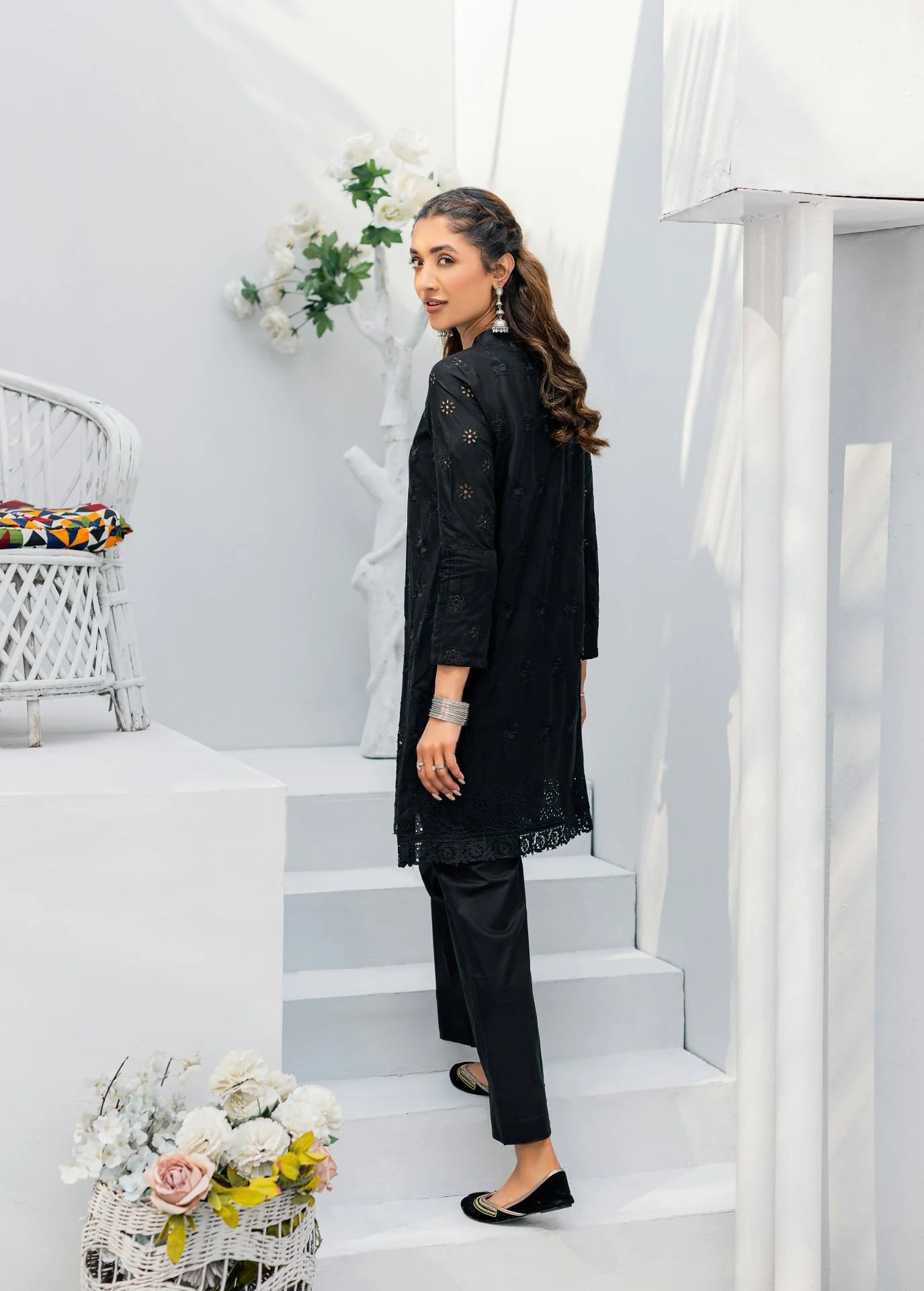 This co-ord set includes a fully schiffli embroidered shirt with lace detailing on the daman and sleeves. It comes with a matching dyed cambric trouser.