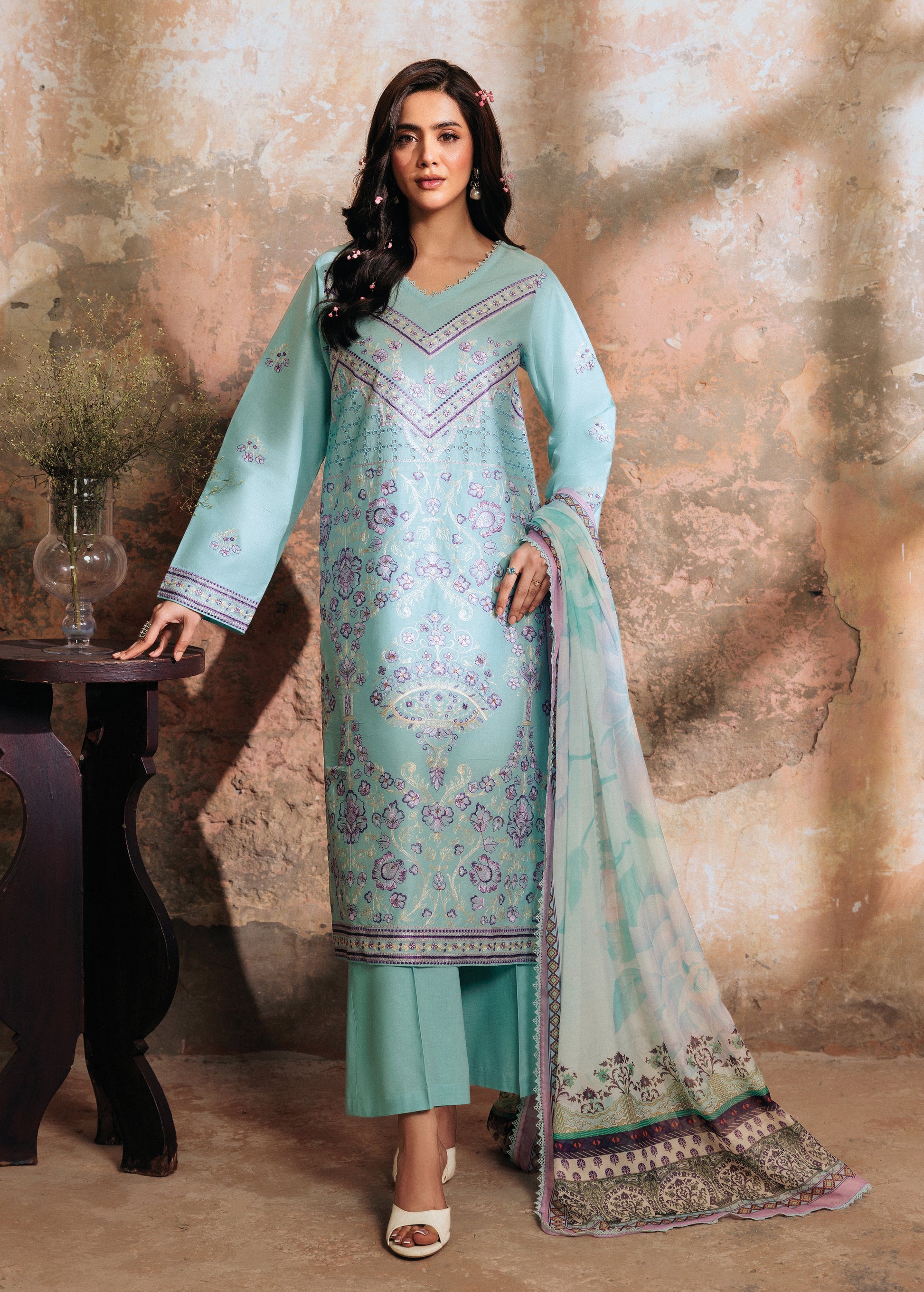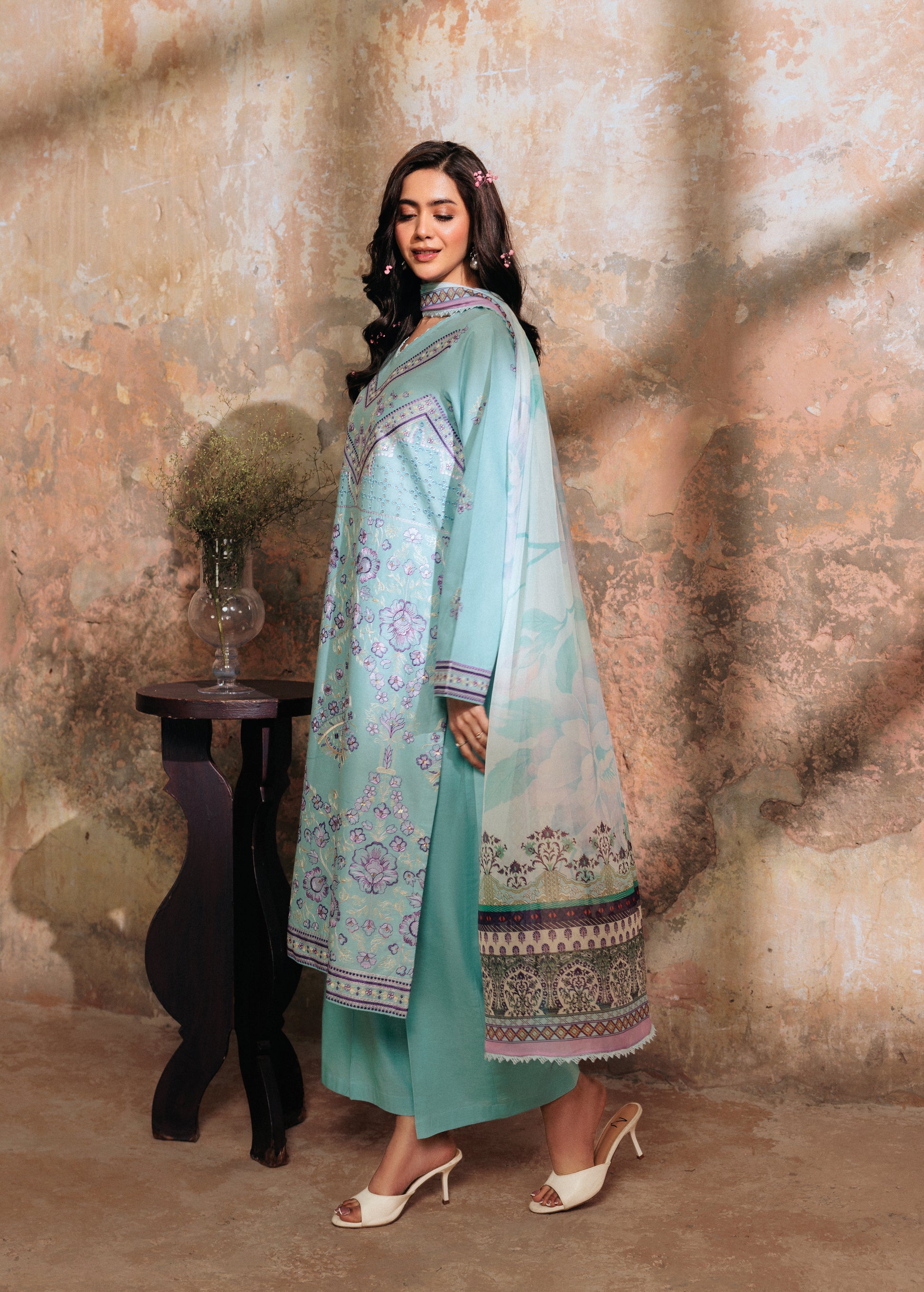 Step into a serene dream with Auralyn, a sky blue 3-piece lawn ensemble that radiates